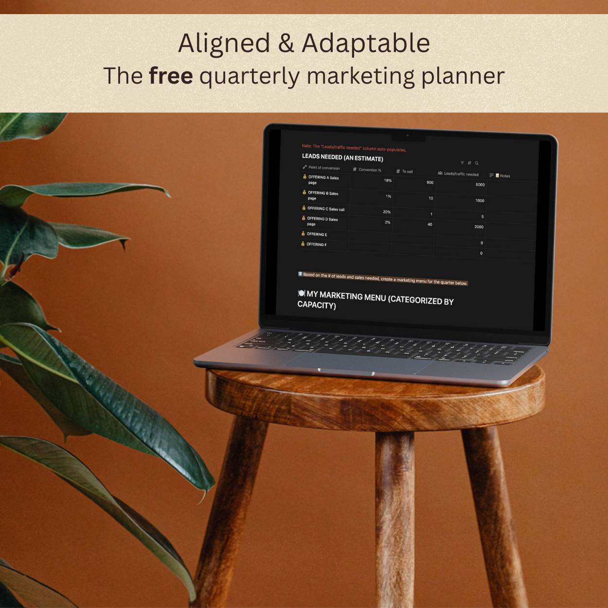 Download an easy-to-use Notion board designed to help you plan your marketing in alignment with your business goals AND your bandwidth.